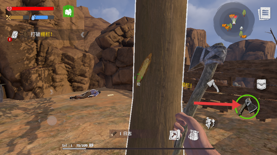 3、点击右侧图标使用斧头砍树,同时准备打破栅栏,推进任务进度。