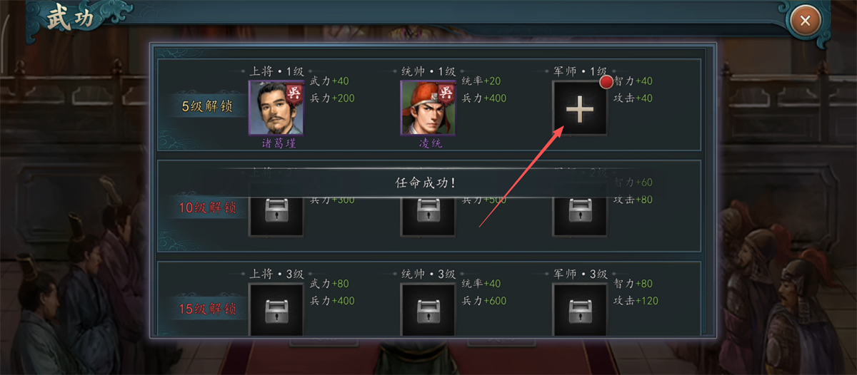 4、在武功界面,点击加号解锁新职位,任命武将后提升战力,助力三国征战啦。