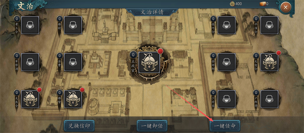 1、在文治界面,点击【一键任命】,可快速安排文官赴任,高效提升内政管理效率哦。