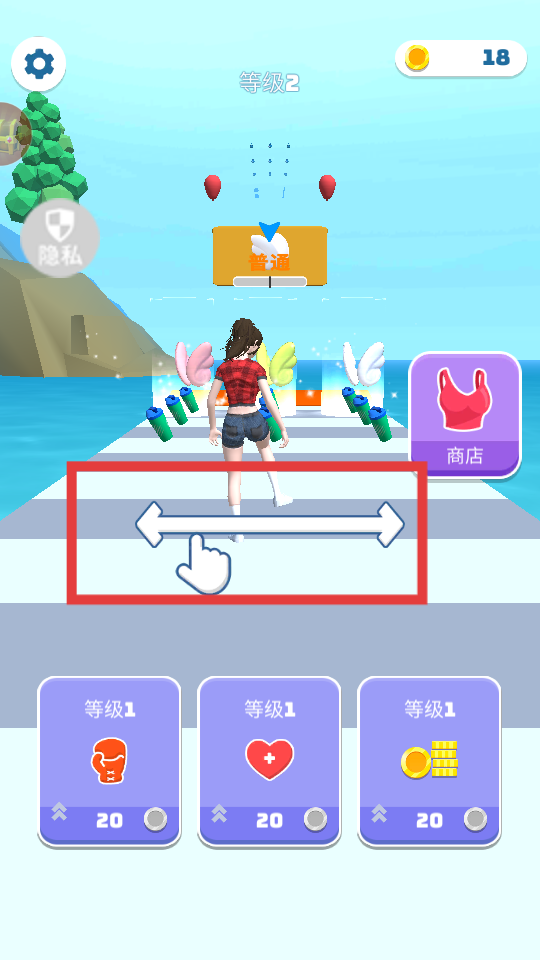 1、进入游戏界面后,滑动红框内的左右箭头控制键,操控角色在跑道上移动,避开障碍。
