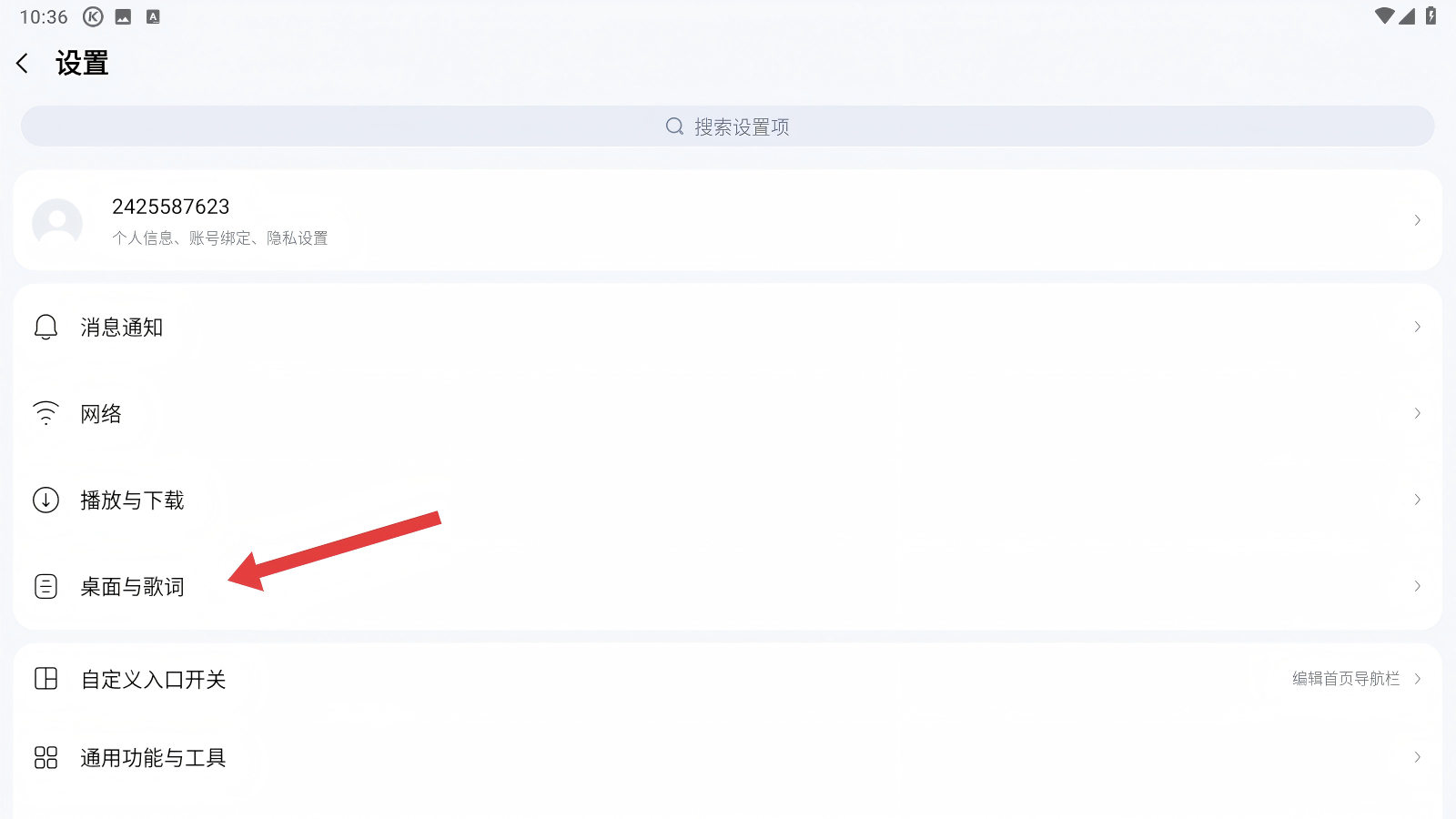 3、进入设置界面后,点击【桌面与歌词】选项,进入歌词相关设置页面。