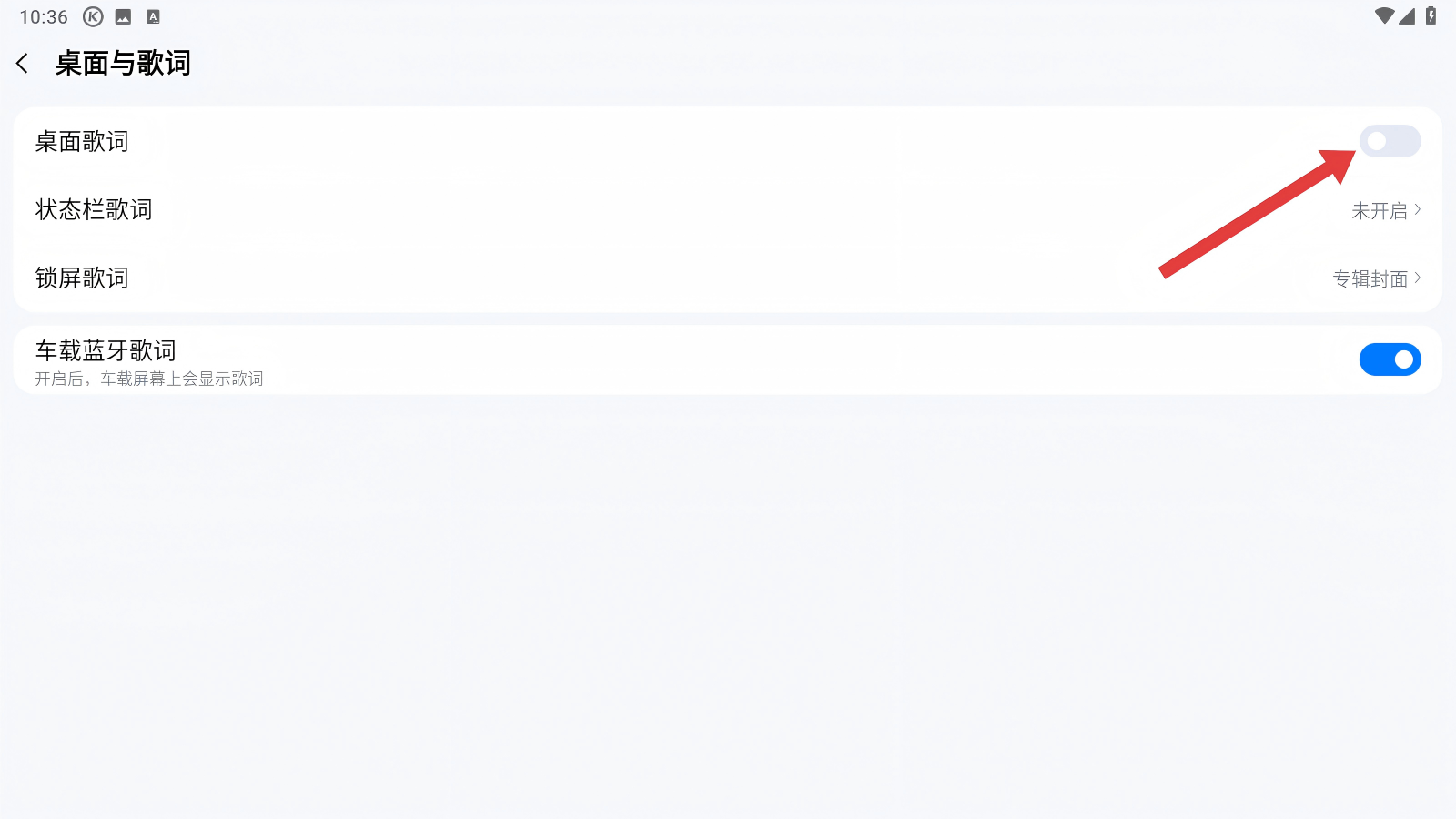 4、在【桌面与歌词】页面,找到【桌面歌词】对应的开关,点击开启,就能在桌面显示歌词。