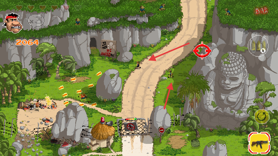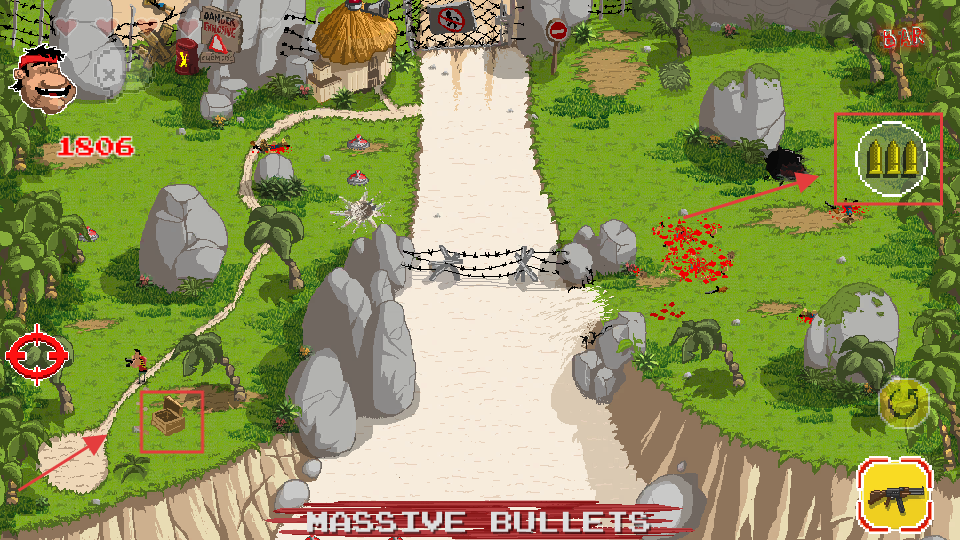 2、关注右侧弹药图标补充弹药,沿箭头路径取宝箱道具,消灭沿途敌人积累分数。