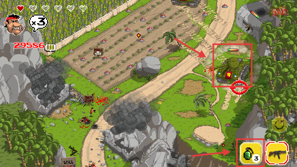 4、遇【坦克】用【手榴弹】(数量3)主攻,配合枪械射击,补充弹药躲避攻击。