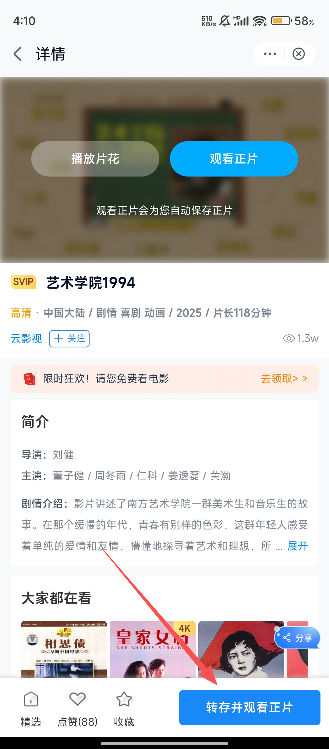 3、在影片详情页点击【转存并观看正片】,若需观看可选择开通权益继续操作啦。