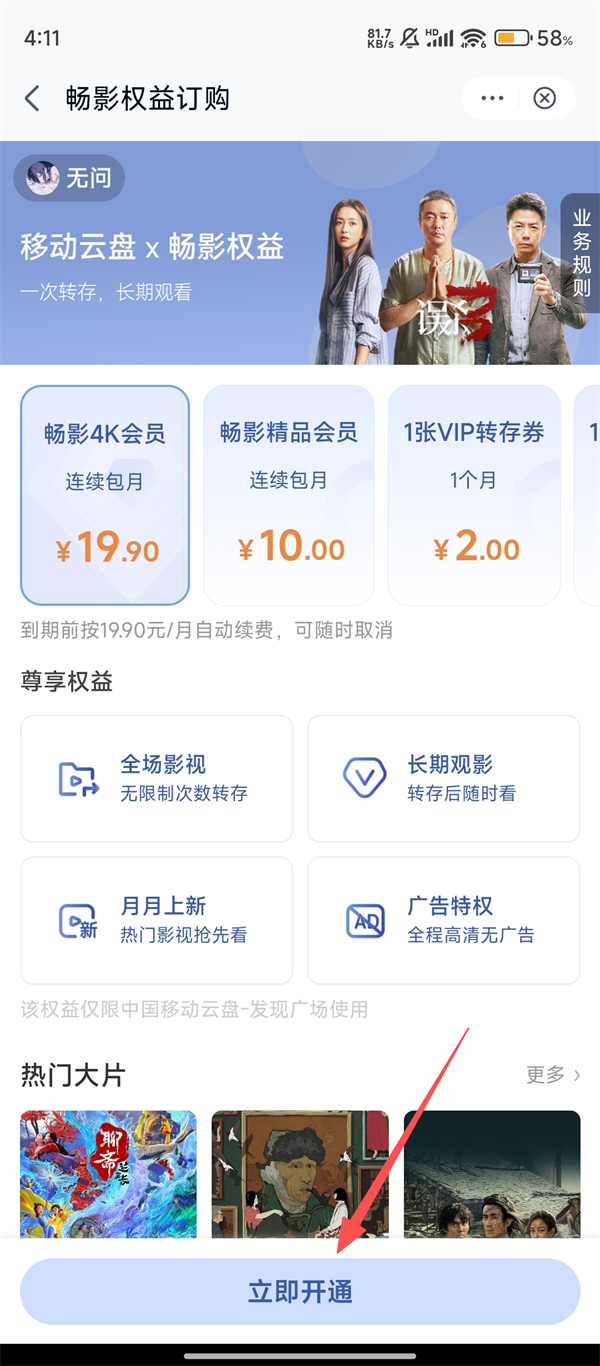 4、在畅影权益订购页,根据需求选择会员类型,点击【立即开通】,享受相关观影权益啦。