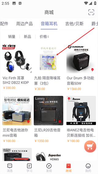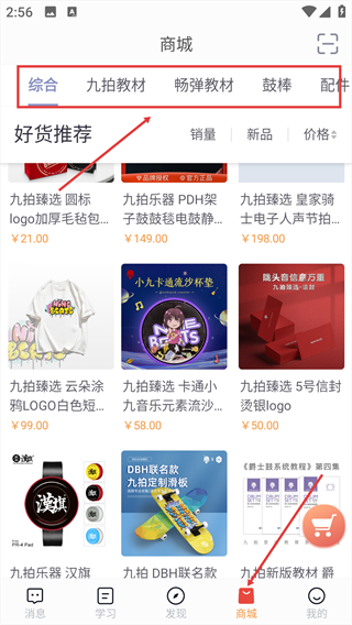 电子商城中除了可以购买乐器及附件产品,还可以购买九拍爵士鼓、吉他、贝司、行进打击乐、马林巴、小军鼓等各个学科的系统教材及全国社会艺术水平考级教材,通过教材扫码解锁功能,在App中可以解锁教材中所有的示范音频和伴奏音频。