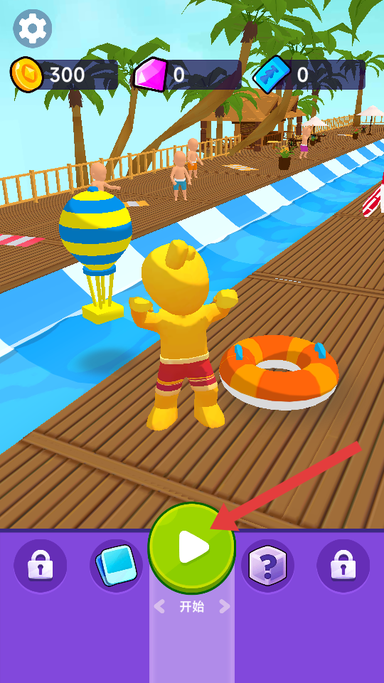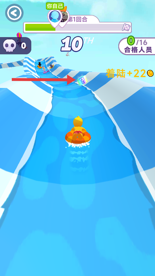 2、游戏开始后,进入【第1回合】,操控角色在水滑梯上前进,注意收集途中如【箭头所指】的道具来获取奖励。