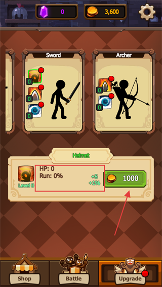 1、在角色升级界面,消耗【1000】金币可提升【Helmet】属性,增强【Sword】-【Archer】等角色的战斗能力。