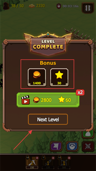 4、关卡完成后获得【Bonus】奖励,含【1400】金币-【30】星星,点击【NextLevel】开启新关卡。