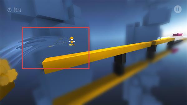 2、操控角色在黄色跑道上奔跑,遇到断层时跳跃通过,维持前进节奏。