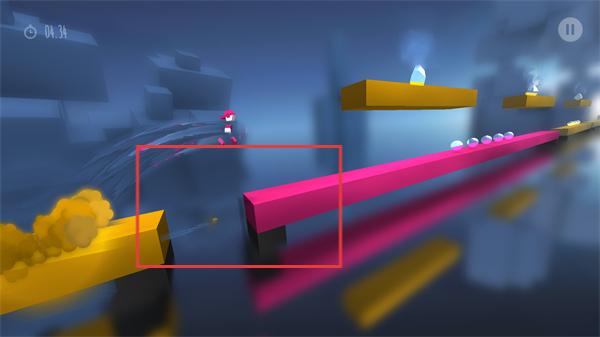 游戏采用斜侧面视角,整个场景由数个浮空平台构建而成,这些平台全部被刷上了红、黄、黑三色,在奔跑的过程中,当玩家触碰到哪一平台即需要立马旋转切换以配合同样的颜色,就比如上一秒你还是裹着鲜艳玫红的小人儿,还没等眨眼,就一头扎进了柠檬黄的&染缸&,可谓是炫酷至极同时,脚后不断扬起的&尾气&、加速过程中环绕四周的波纹气浪以及落地瞬间飞溅的方块所呈现的效果看上去都相当带感,也仿佛形成了一种魔力促使人们想到游戏里去爽上一把