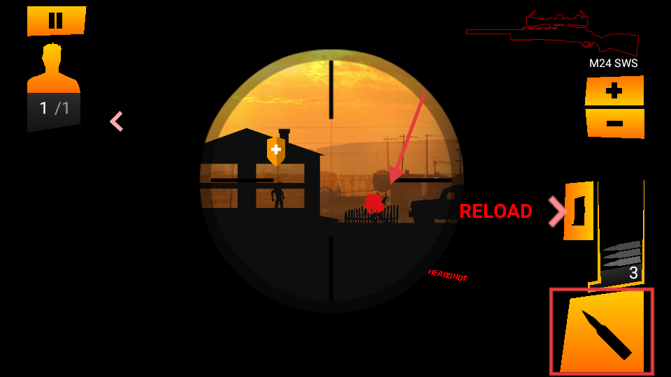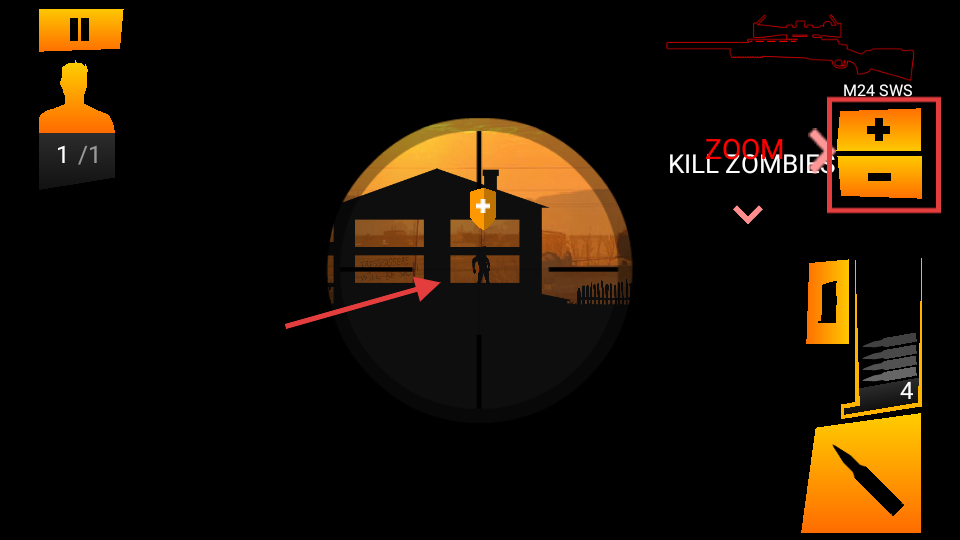 2、利用右侧【+】【-】调整瞄准镜缩放,看清丧尸位置,预判轨迹后开枪,提升命中。