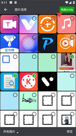 3、在【图片选择】页选中需排版的图片,点击【完成(3/20)】,进入排版编辑页。