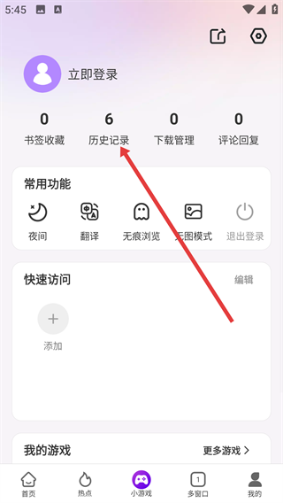 1、打开微米浏览器App,点击底部【我的】,进入个人页面,开启删除历史记录的操作。