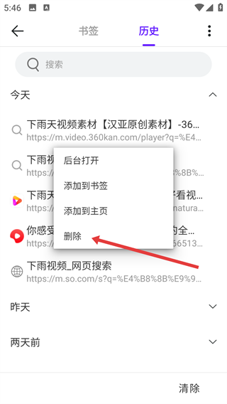 4、在弹出的选项中,点击【删除】,即可移除该条历史记录,轻松整理浏览痕迹哦。