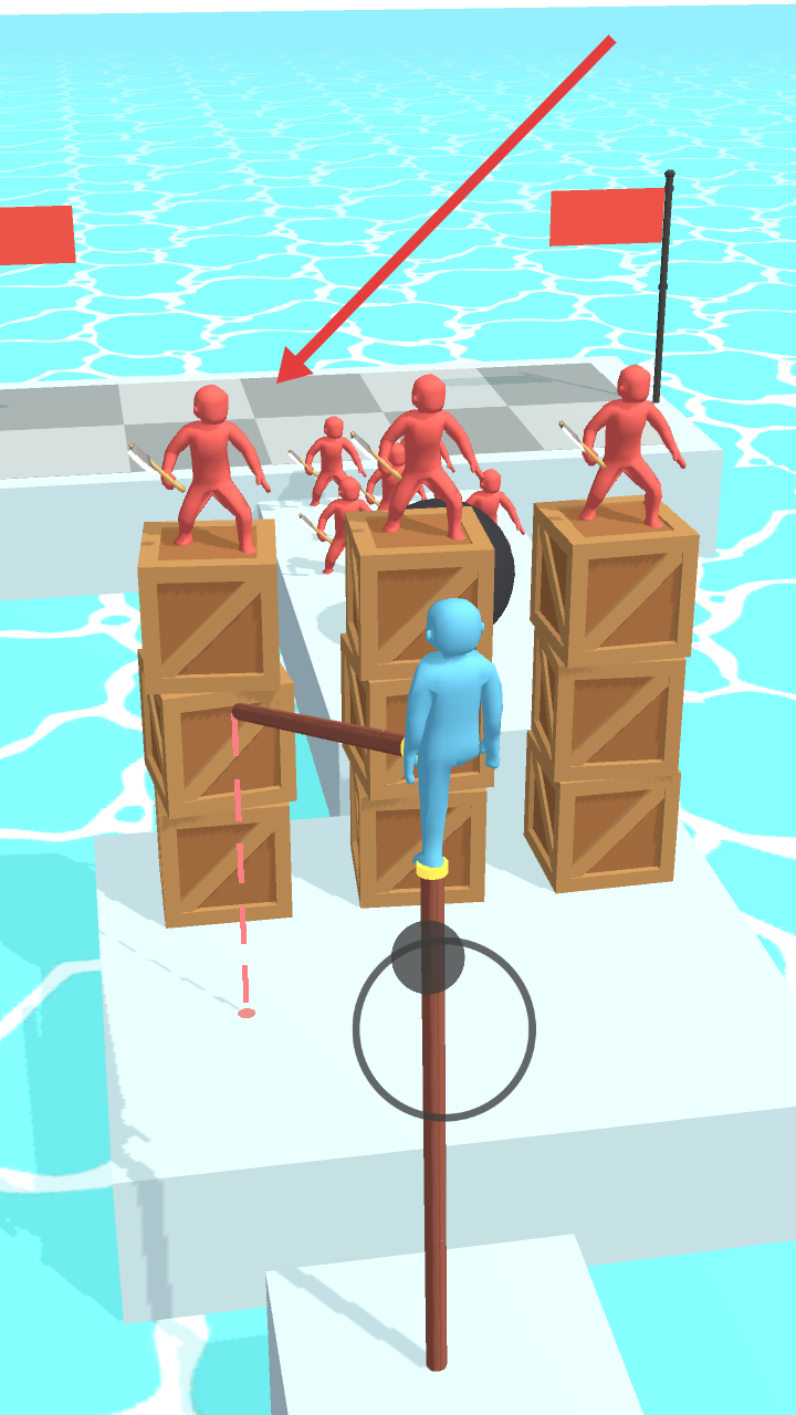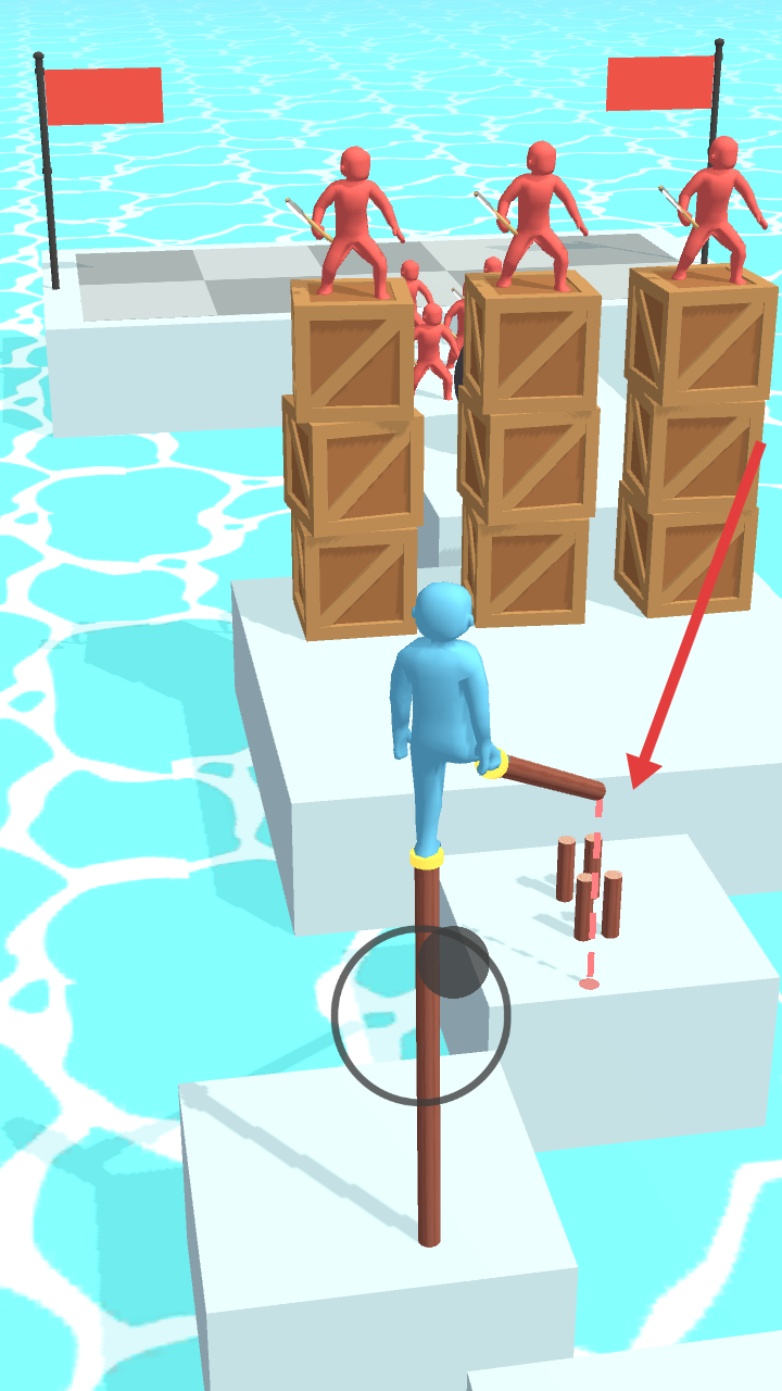 3、操控长杆攻击敌人,清除前方的红色敌人,推进游戏进度。