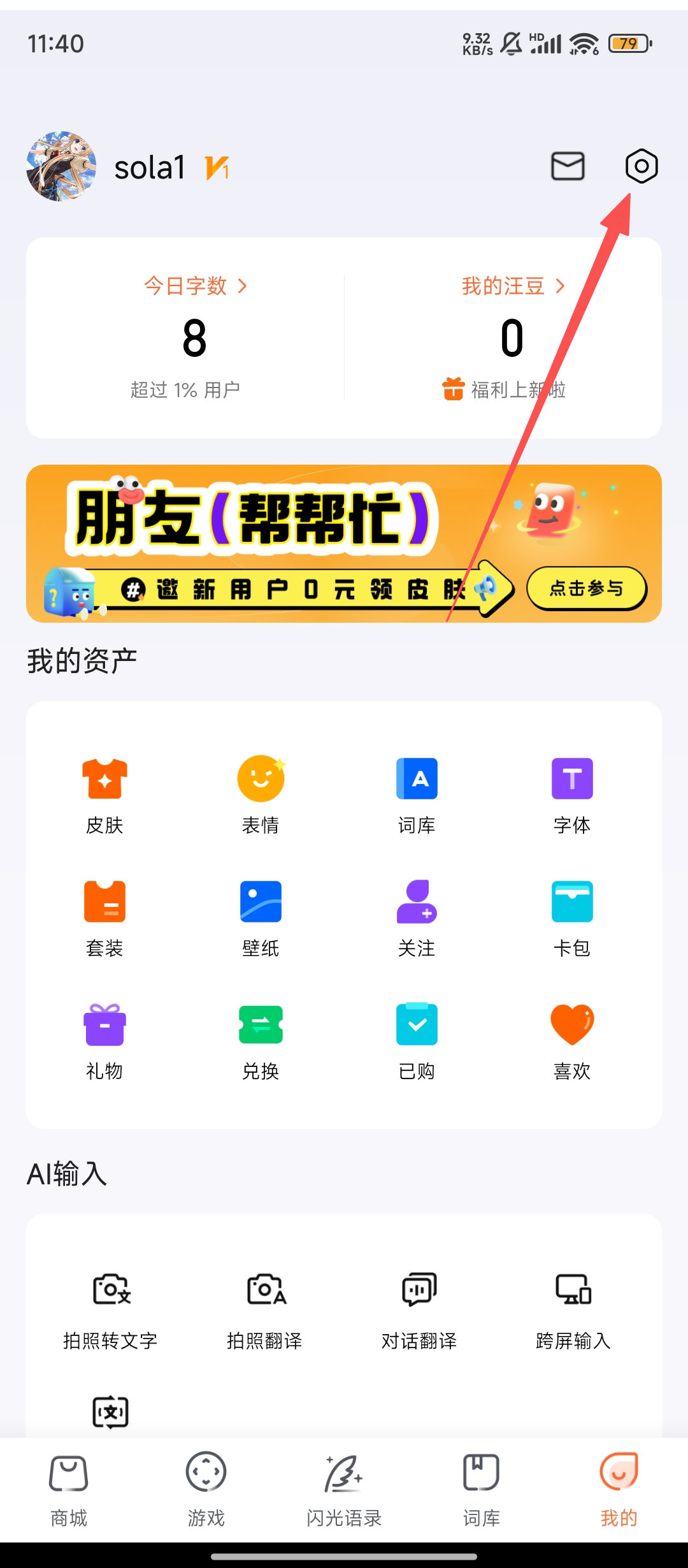 1、进入搜狗输入法的【我的】页面后,点击右上角的【设置】图标,为后续调整广告设置做准备啦。