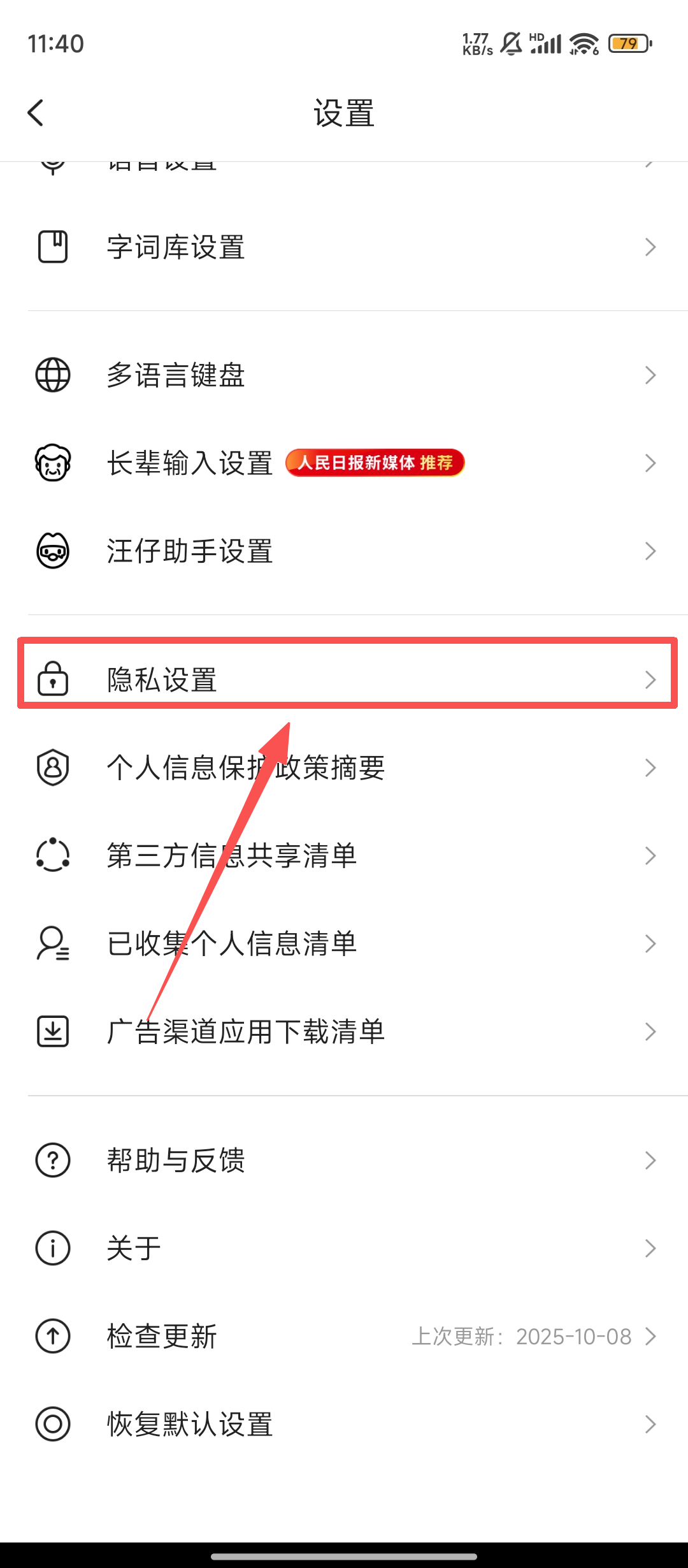 2、在设置界面里,找到并点击【隐私设置】选项,便能进到隐私相关的设置页面,去寻找广告管理的入口啦。