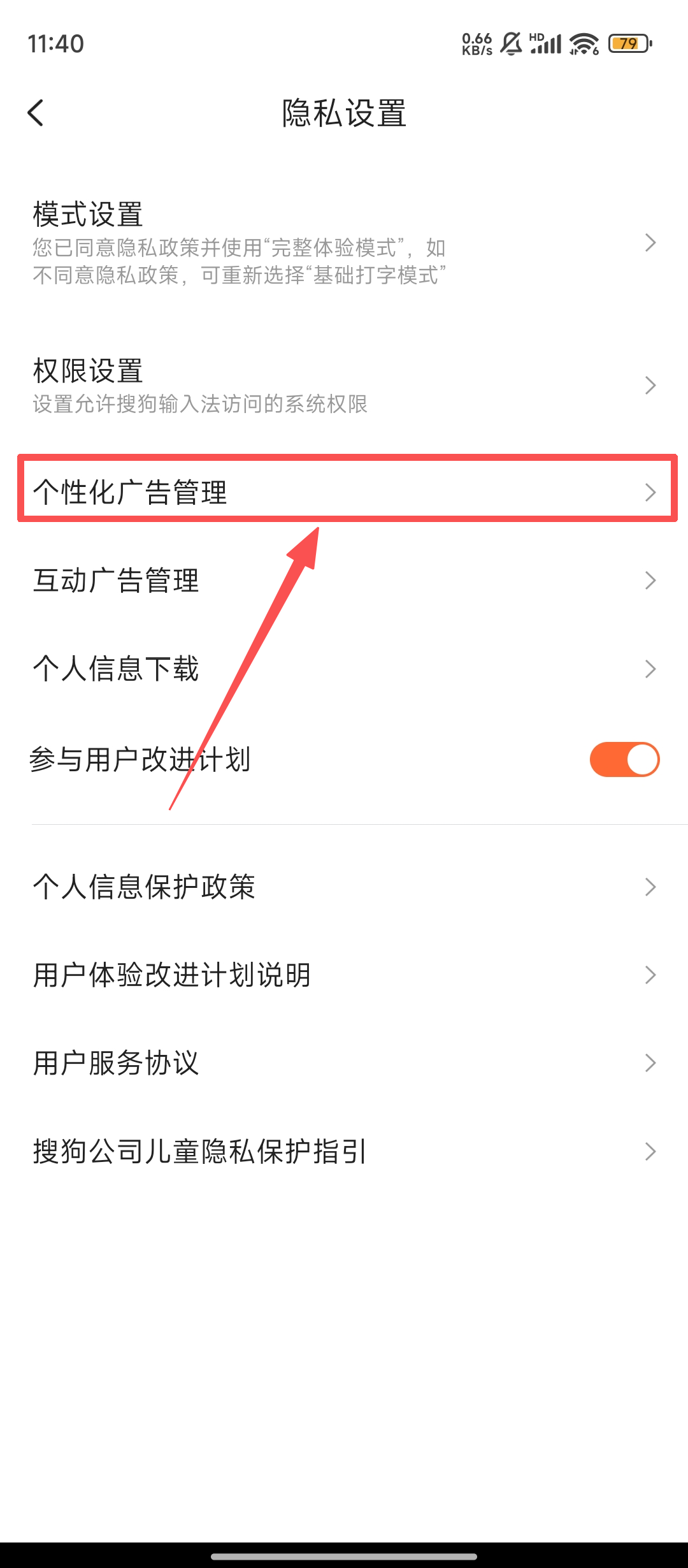 3、进入隐私设置页面后,点击【个性化广告管理】选项,即可进入广告管理的具体设置页面。