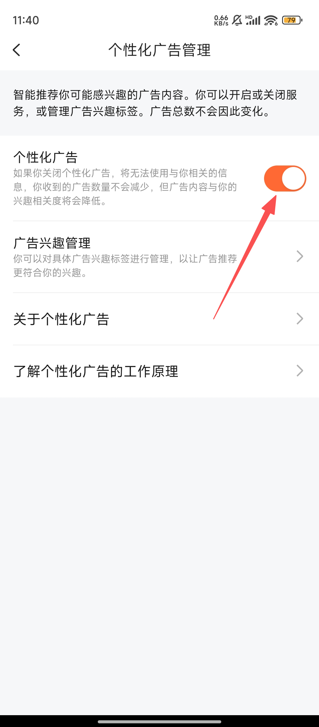 4、在【个性化广告管理】页面,看到【个性化广告】的开关,点击它即可关闭,操作起来挺简单哦。