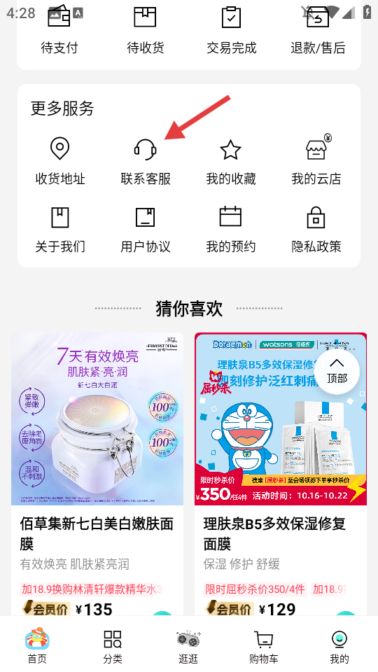 2、在个人页面点击【联系客服】,进入在线客服界面。
