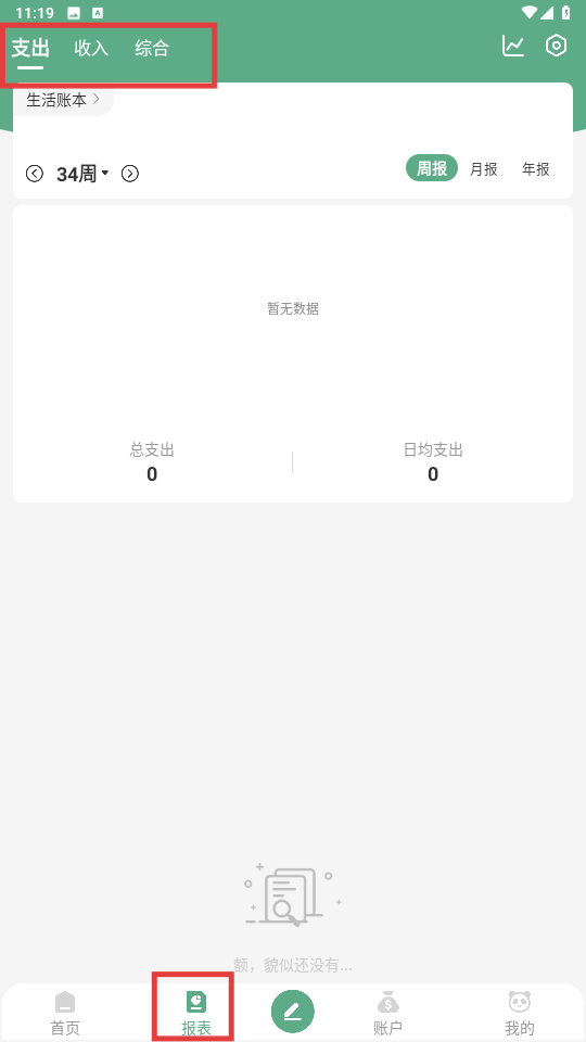 4、点击底部【报表】,查看【支出】【收入】【综合】的周报、月报或年报数据。