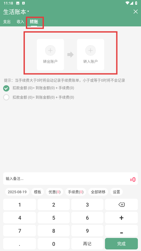 3、切换到【转账】标签,选定转出与转入账户,填金额等信息,完成转账记录。