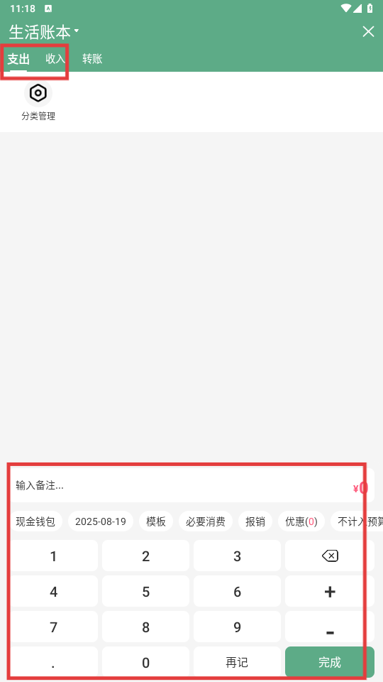 2、在记账页选择【支出】或【收入】标签,输入金额等信息后点【完成】,记录收支。