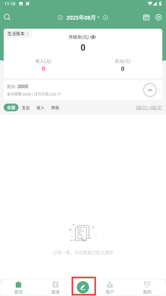 1、点击底部中间的记账按钮,进入生活账本的记账界面,开始记录收支或转账。