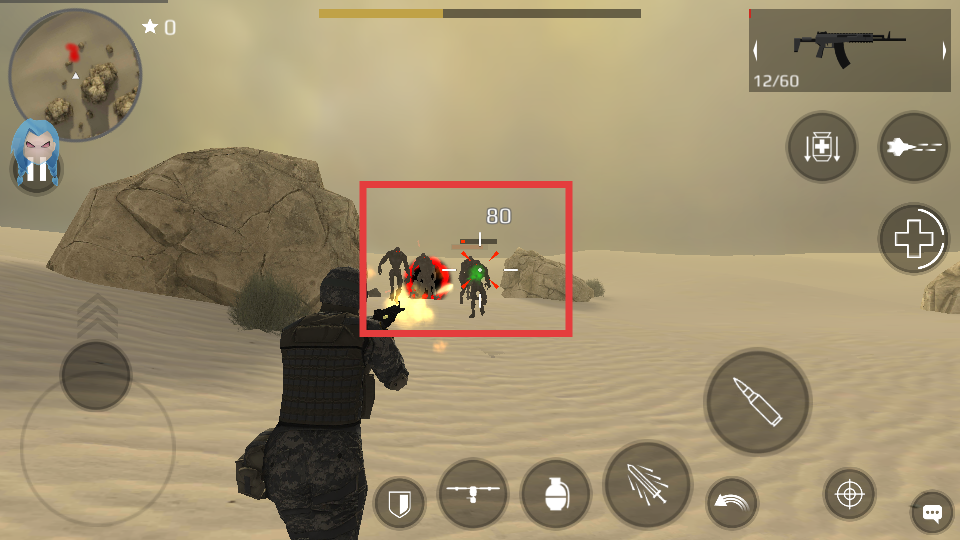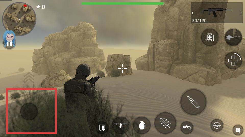 1、利用左侧【虚拟摇杆】控制角色移动,在沙漠等场景中灵活走位,借助岩石、植被等掩体躲避敌人攻击。