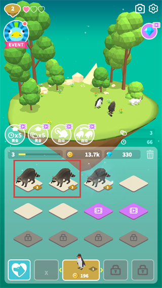 1、在游戏场景中将【浣熊】合并,升级动物提升收益,积累资源解锁更多玩法。
