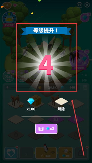 4、提升等级到【4】级可解锁新区域,获得钻石奖励,解除锁定的位置扩展动物放置空间。