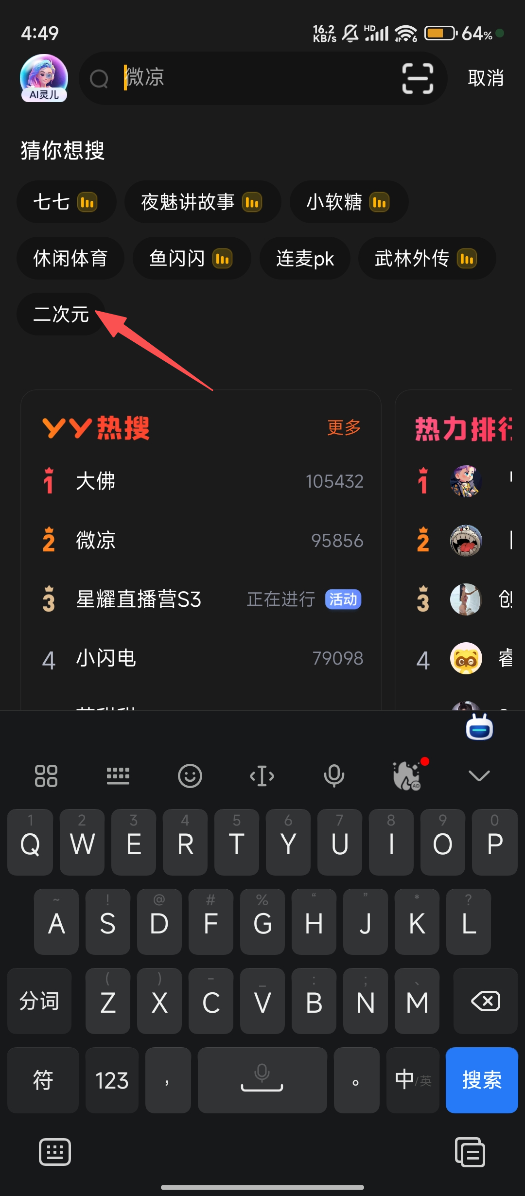 3、在搜索栏输入关键词后,也可点击【猜你想搜】里的标签,快速找到相关主播群体呢。