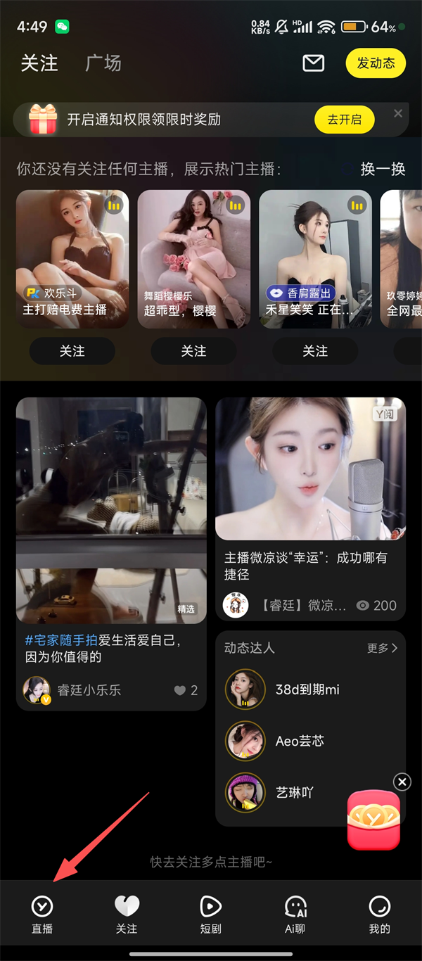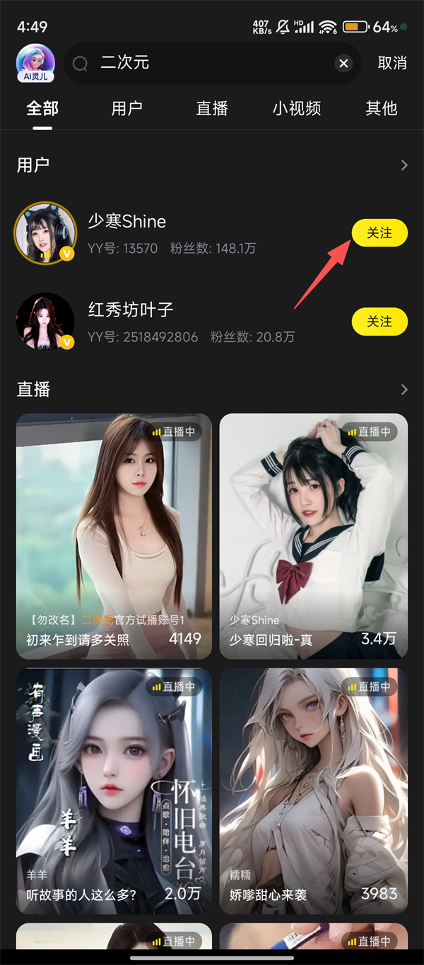 4、在搜索结果中,找到心仪主播后点击其右侧【关注】按钮,就能关注该主播,方便后续查看其直播动态啦。