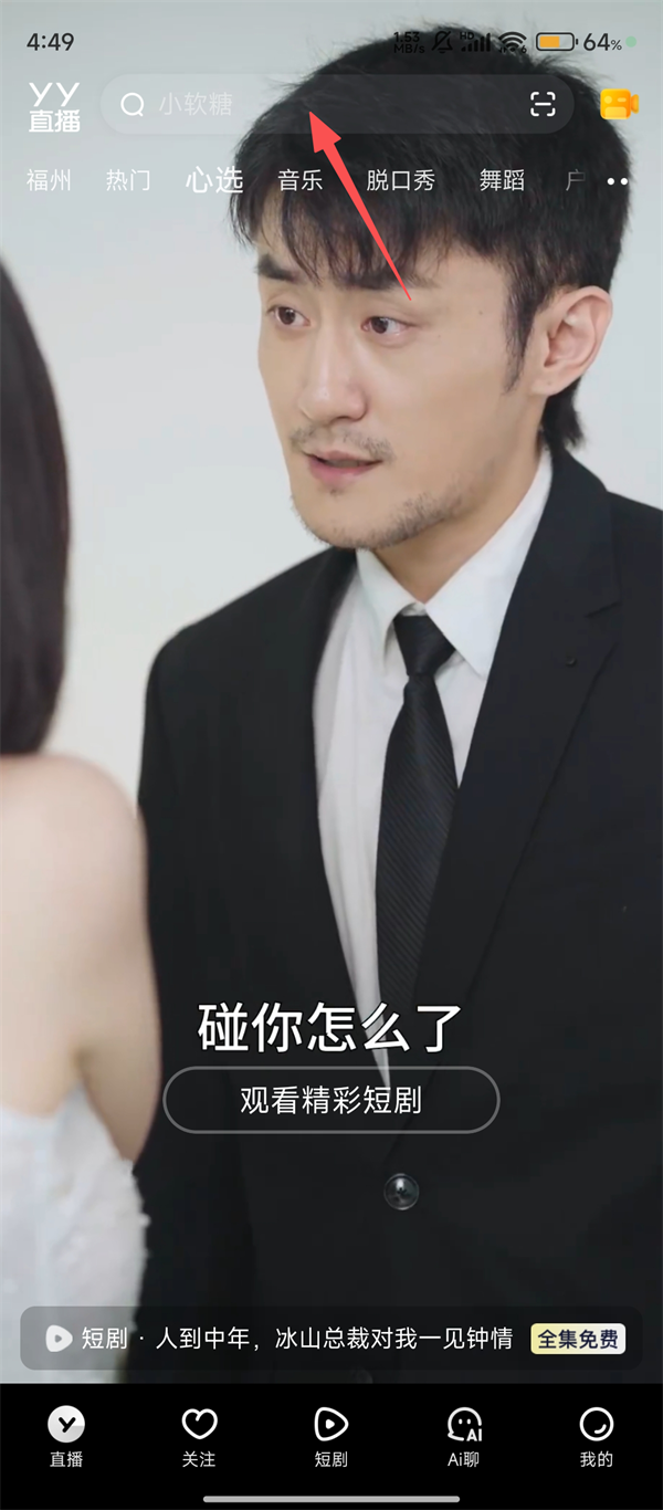 2、进入直播页面后,点击顶部【搜索栏】,输入主播相关关键词,开启搜索之旅哦。