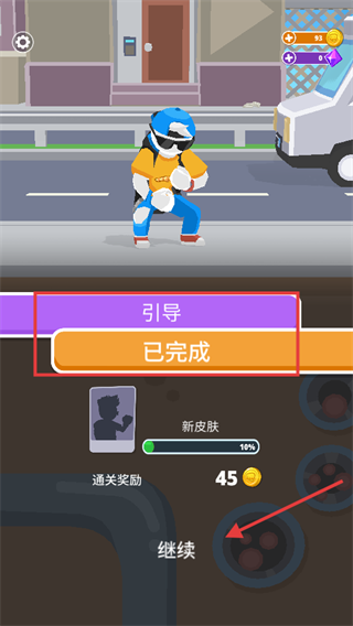 4、引导【已完成】,点击【继续】,领取【45】金币,解锁【新皮肤】进度,备战下一关。