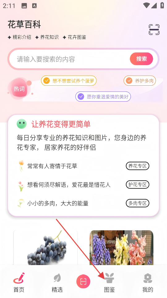 1、在花草百科首页,点击底部【图鉴】,进入观花图谱页面。