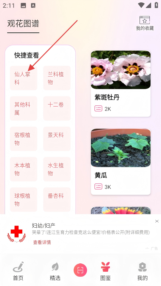 2、在观花图谱的“快捷查看”区域,点击【仙人掌科】分类。