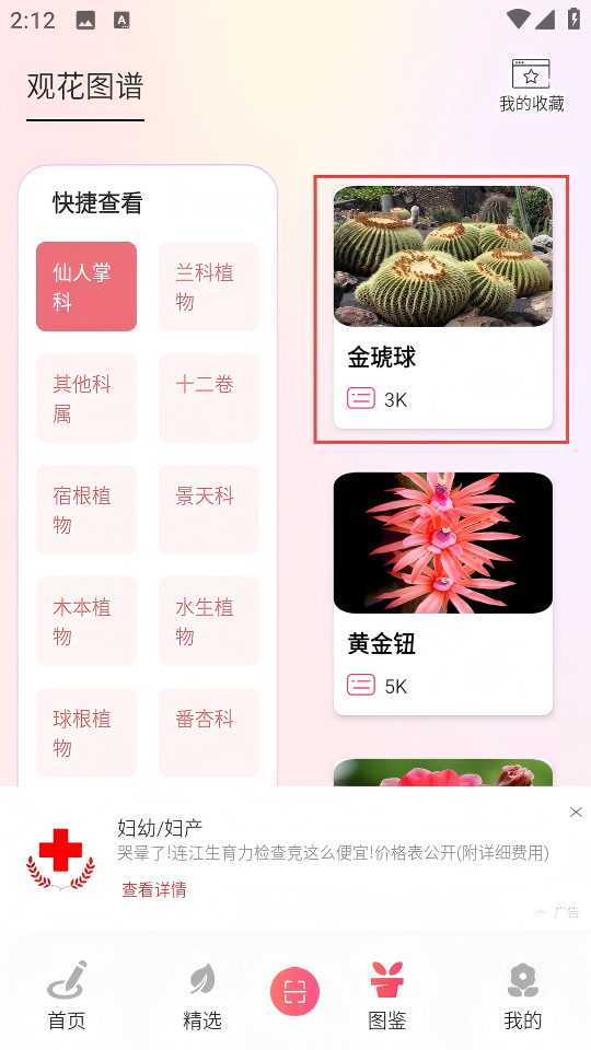 3、在分类结果里,选择“金琥球”花卉卡片,进入详情页。