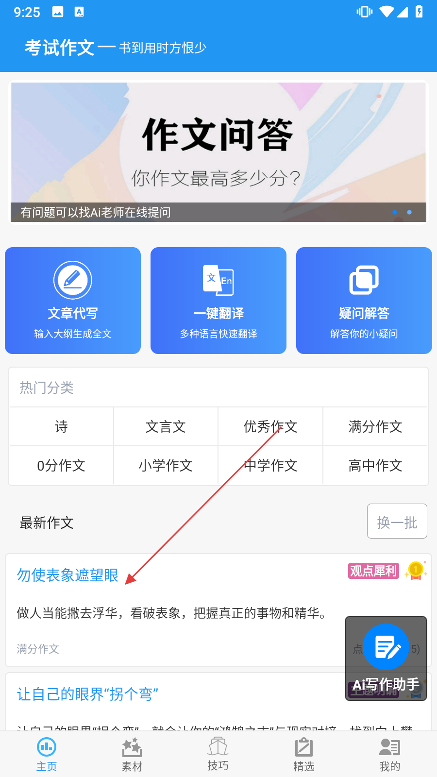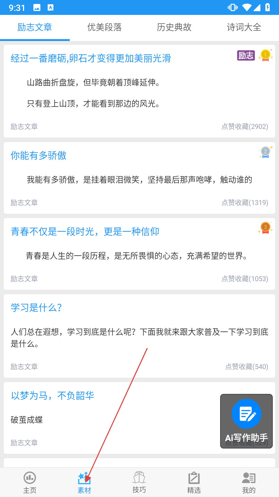 2、点击底部导航栏【素材】,浏览励志文章等写作素材。