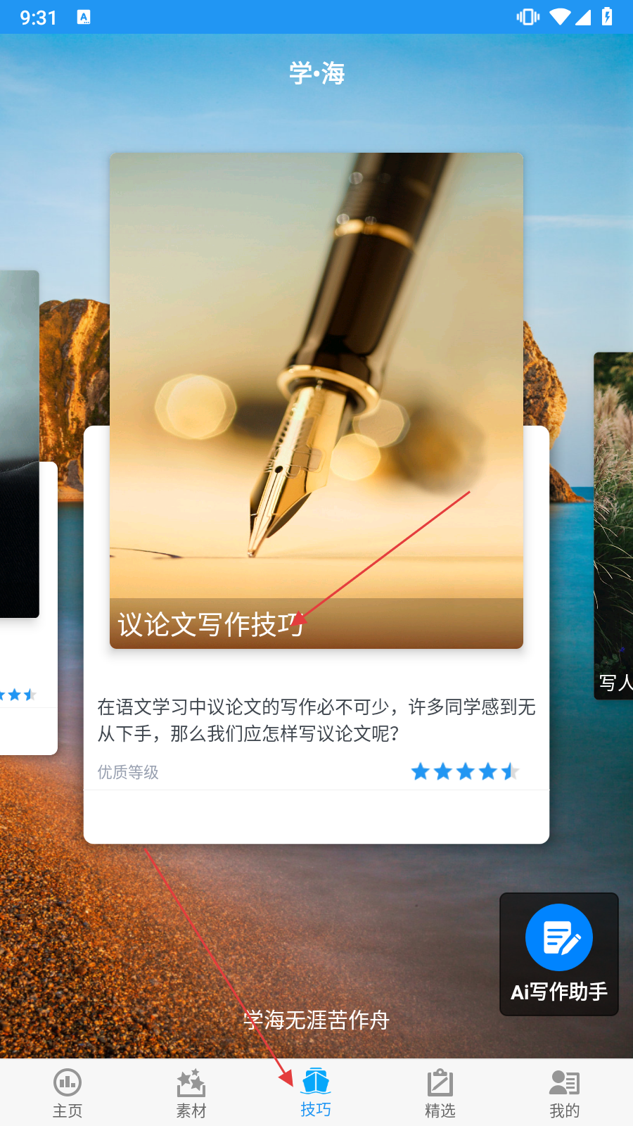 3、点击底部导航栏【技巧】,学习议论文等写作技巧。