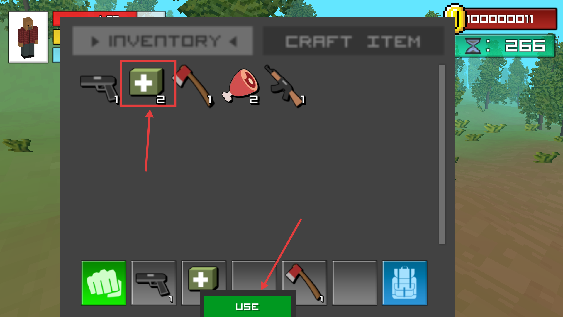 4、打开背包界面,使用【医疗包】恢复生命值,增强在僵尸世界的生存能力。