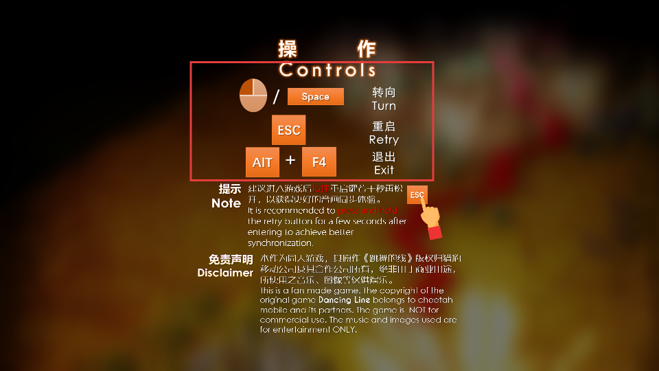 1、查看操作说明,【Space-按键】控制转向,【ESC-按键】重启,【ALT+F4-组合键】退出游戏。