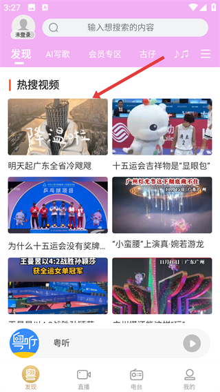 1、打开粤听App,在【发现】页可浏览热搜视频,点击感兴趣的视频封面,即可进入播放页啦。