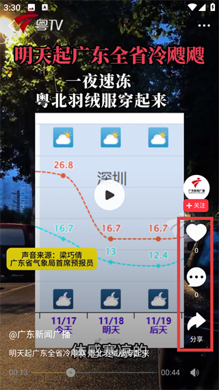 2、在视频播放页,可点击右侧爱心点赞、评论图标互动,还有分享按钮哦。