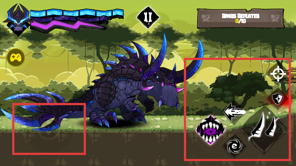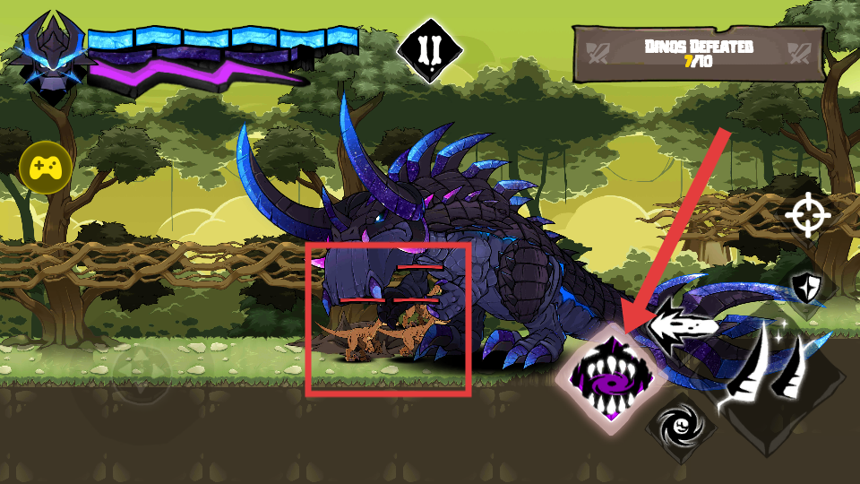 3、面对红框内的敌人,及时点击紫色技能图标发起攻击,借助全解锁的强力技能,快速提升【DINOS-DEFEATED】进度。