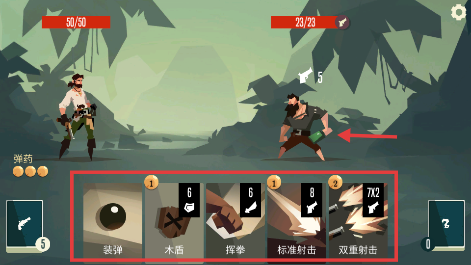 2、战斗时下方有【装弹】【木盾】【挥拳】等卡牌,可选择卡牌对敌人发起攻击或防御。