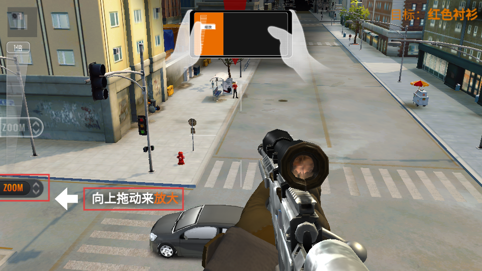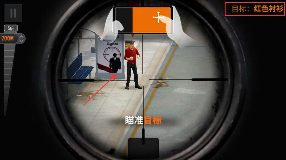 2、在狙击镜视角下,对准穿【红色衬衫】的目标,确保十字准星重合,完成射击前的精准瞄准步骤。