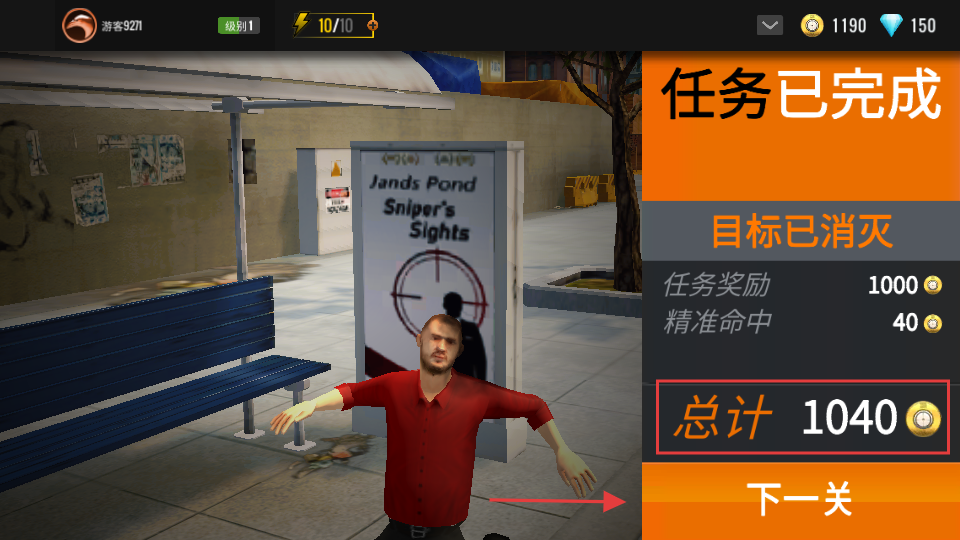 4、任务完成后领取总计【1040】金币奖励,点击下一关可继续挑战新的狙击任务,提升狙击技能等级。